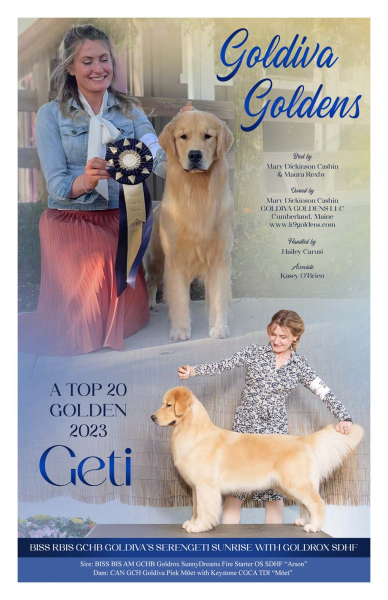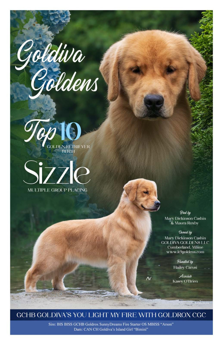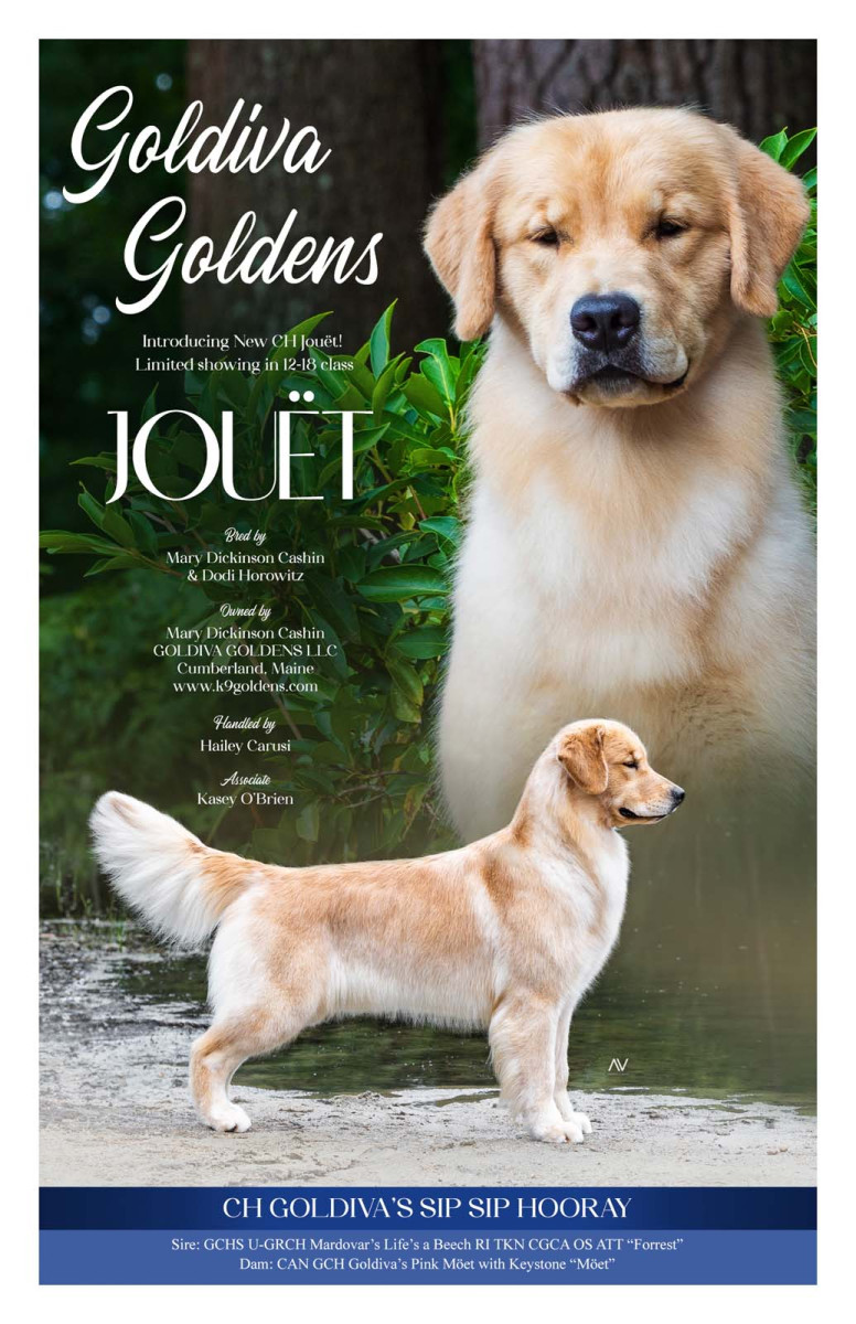 Katie & I are very excited to watch 5 of our CH Goldiva Goldens at the National Golden Retriever Show in Springfield on October 9th. Last year, Geti was #4 Female in the US and ranked #5 Breed including the males for breed points. She had the invitation for the Top 20 gala in Oregon for her award but alas, too far. This year, Sizzle was #10 female and #25 Breed. The National show is at the Big Expo in Springfield, MA. We’re thrilled to see all the lovely Goldens from across the US. It’s the largest Golden Retriever only show. Hundreds of Golden’s! Attending are AM GCHB Geti SDHF, AM GCH Blackjack, AM CH Jouët, AM CH Brinkley and Katie’s girl, Sake who is halfway thru her Am CH title.