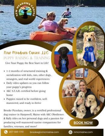 New Meadow Canine, LLC, Brooke Pizzolato, owner, is a certified professional dog trainer in Harpswell, Maine with AKC Obedience & Rally titles on her personal dogs and a passion for producing well-mannered canine companions for families, veterans, and more!
