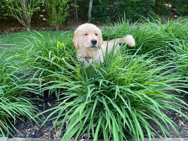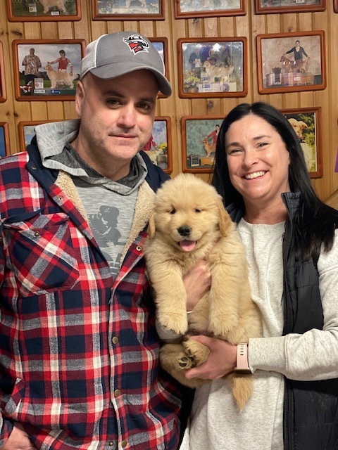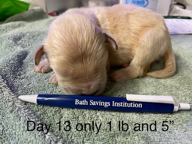 Kistler, Monty & Artemis are my 3 orphaned pups when mama Merlot ate a loaf of bread with plastic sleeve and metal twist tie 13 days before her due date. The metal twist tie showed up on her X-ray. It became a terrible tragedy with 3 emergency surgeries; 9 days at Angell Memorial and the loss of 6 puppies. These 3 little miracle pups were 6.75 oz on Day 3 when they came up to me. They spent the first 21 days in an incubator while tube feeding round the clock every 2 hours. It was the hardest and most challenging litter in my 40 years of raising Goldens.