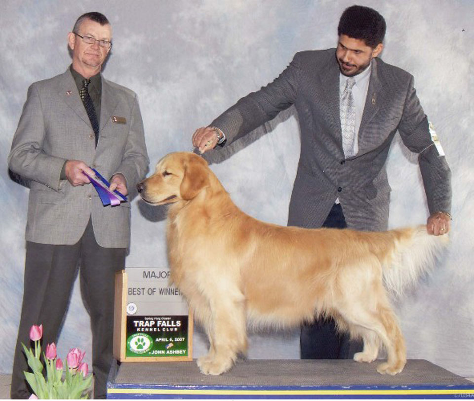 July 5, 2007 Striker finished his American Champion title in West Springfield, MA handled by Pam Desrosiers!! We are so proud of Striker and thank Julie MacKinnon & Kathy Sneider, VMD for breeding such a fantastic dog. A special thank you to Jeanette Gould for all the time, TLC, grooming, long distance travelling and connections she’s made for us in handling Striker and making the arrangements to use Pam & Mark Desrosier to finish up his points!! Striker had a real steak dinner on a silver platter! Bone Appetit! We’re anxiously awaiting his New Champion photo…