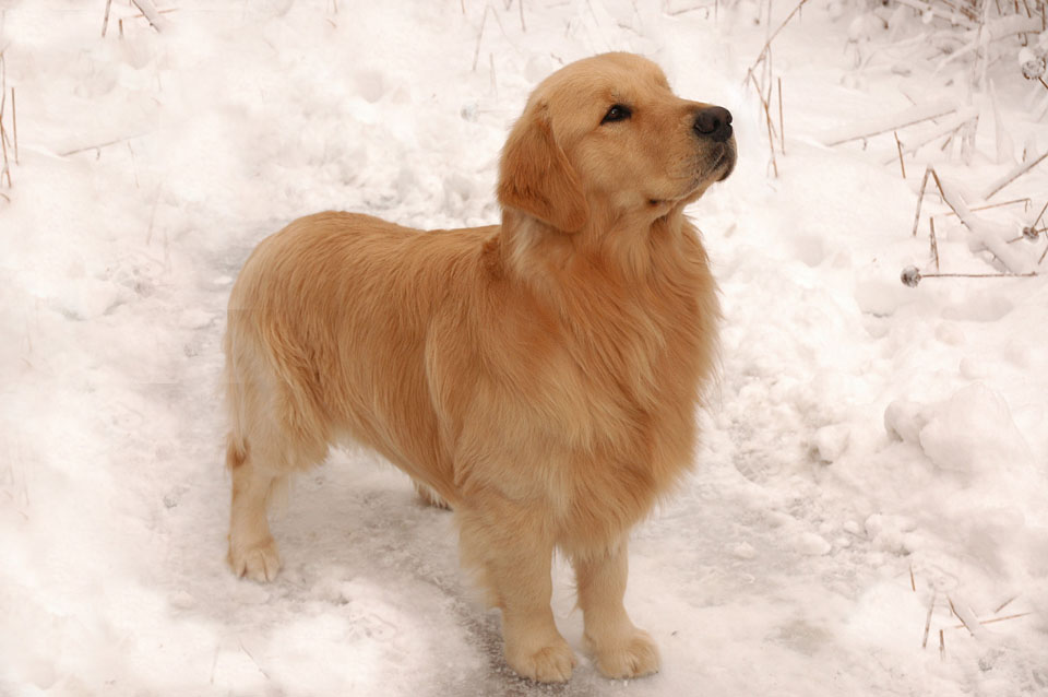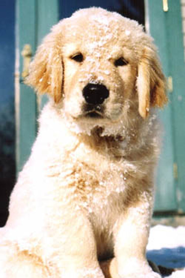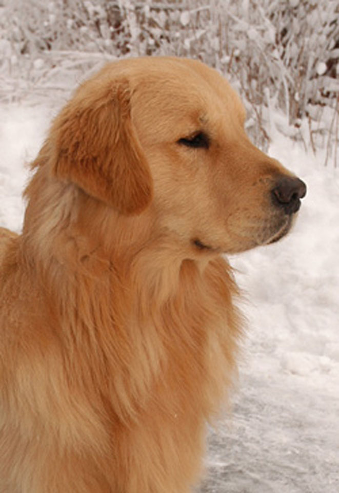 Striker comes from a long line of gorgeous Nautilus Champions. His parents are Am CH Nautilus Purple Passion, “Casanova” and Nautilus New Year’s Toast, “Margarita.” Striker is very light blonde and has a long, lush fur coat to sink your fingers into. One of his grandmothers is English, so he’s shorter in statute but within the AKC standard. He is our little poster boy pup with the sweetest disposition. His whole body wags with enthusiasm as he greets us, usually with our socks or slippers or whatever else he can cram into his mouth! He lets the girls run for the ball; then he takes it out of their mouth to give to us…as if he did all the work!