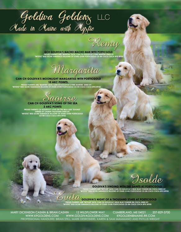 Parents: Martini Am GCH CH/Can CH Goldiva’s Pink Martini ex “Mystic” BISS GCHB CH Tamarack Billions Of Stars Over Poeticgold CD RN TDI CGCA CGCU CGC BPIS